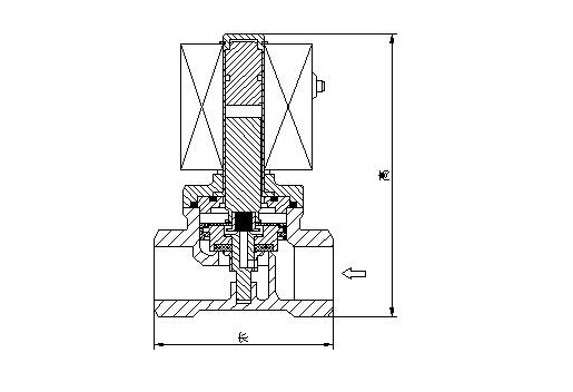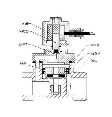 通電時,電磁力把先導孔打開,上腔室壓力迅速下降,在關閉件周圍形成上低下高的壓差,流體壓力推動關閉件向上移動,閥門打開;斷電時,彈簧力把先導孔關閉,入口壓力通過旁通孔迅速腔室在關閥件周圍形成下低上高的壓差,流體壓力推動關閉件向下移動,關閉閥門。
